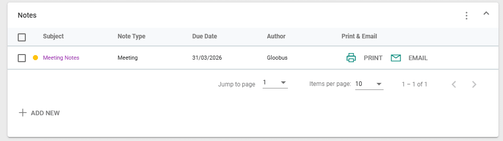 After creating a note, it can be viewed by clicking on the Subject. A note can also be printed or sent via email.