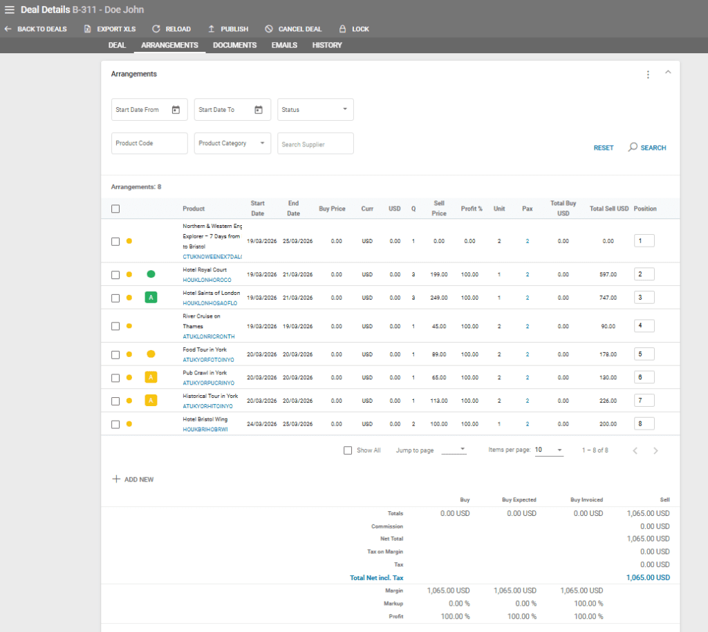 If you need to edit an existing Deal by adding more arrangements, navigate to the Deals list and open the deal you wish to edit. On the Deal page, you will find the Arrangements section: