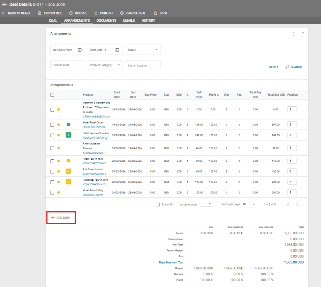 Click “ADD NEW” and follow the same steps as in the deal creation process. This involves selecting a start and end date for the search and then choosing the product you wish to add as a new arrangement to the existing Deal.