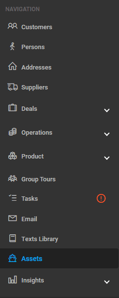 To create an Asset, navigate to ‘Assets’ from the main left menu and click the ‘+’ icon to add a new entry.
