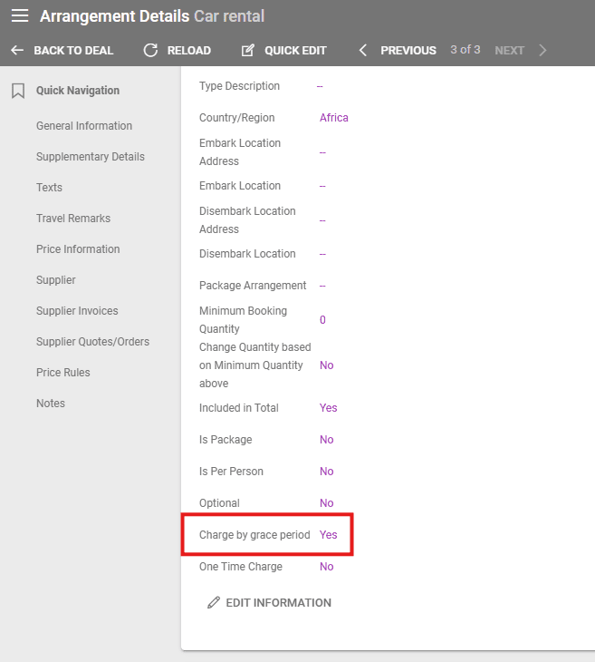 The Grace Period field is used to rent vehicles for 24 hours or less without charging the arrangement price for two days. The Grace Period field from the arrangement’s details must be checked True to set this up, and the arrangement also needs the Begin and End Time so the system can calculate whether the arrangement is booked for less than 24 hours.
