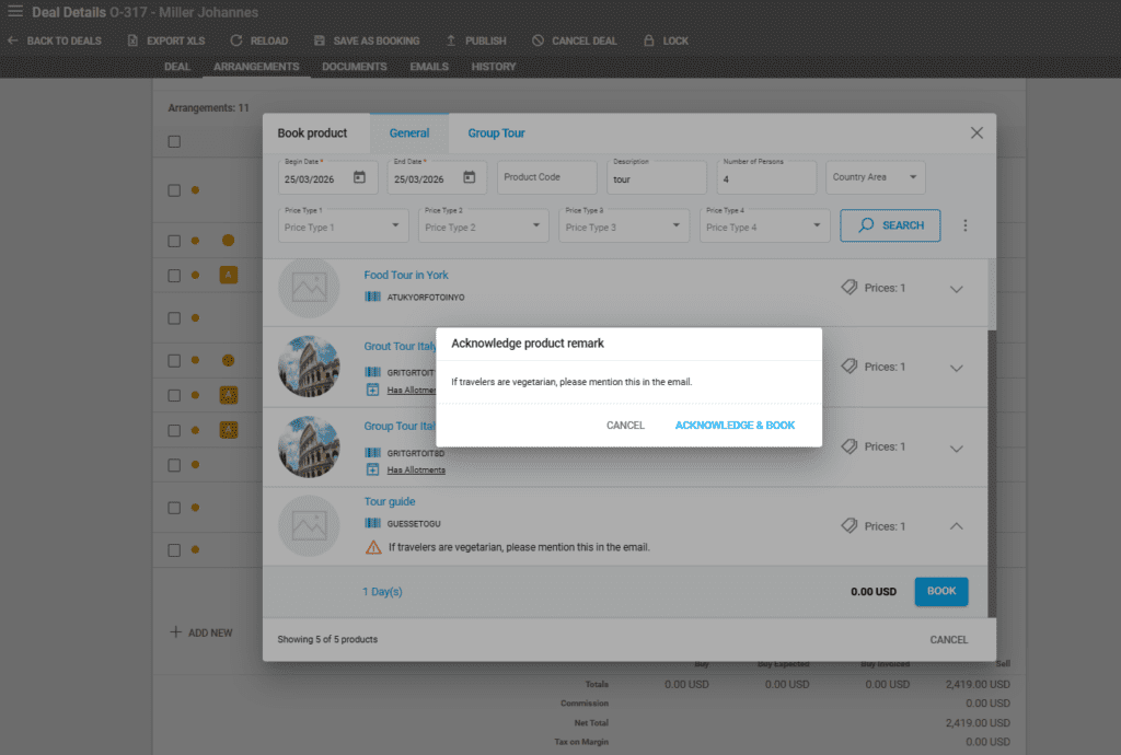 If a Product has a Warning Rule set on its price, upon booking the product the warning is displayed through an overlay window that has to be Acknowledged. The warning is also visible next to an exclamation mark icon, and in the Arrangement Details.