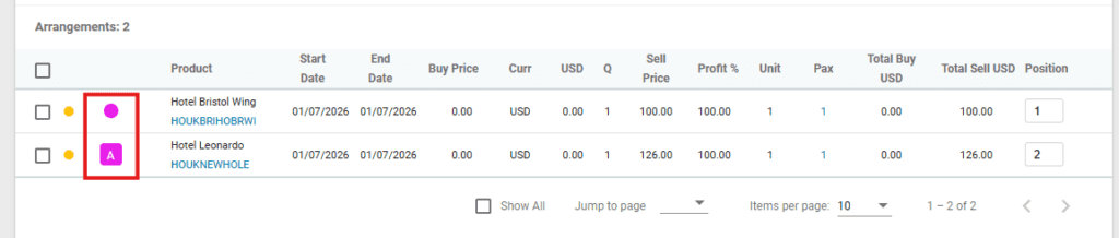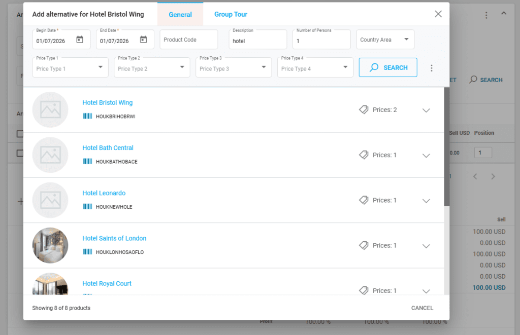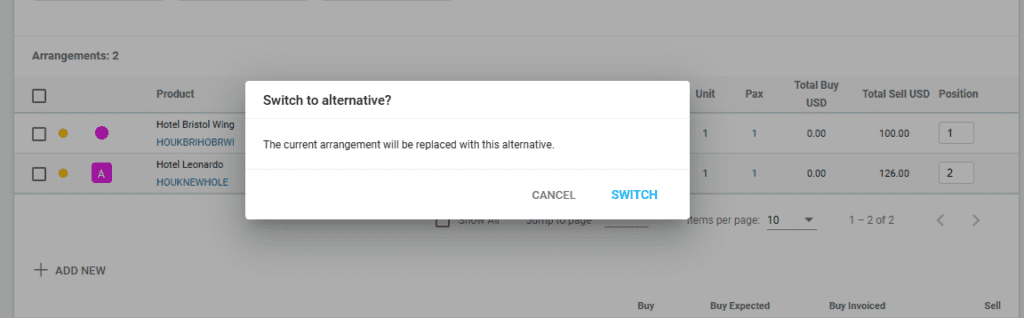 In case an arrangements can have alternatives, they can be booked and switched easily in Victoury. Switching to a different alternative also updates the deal total accordingly. An arrangement can have multiple alternatives.