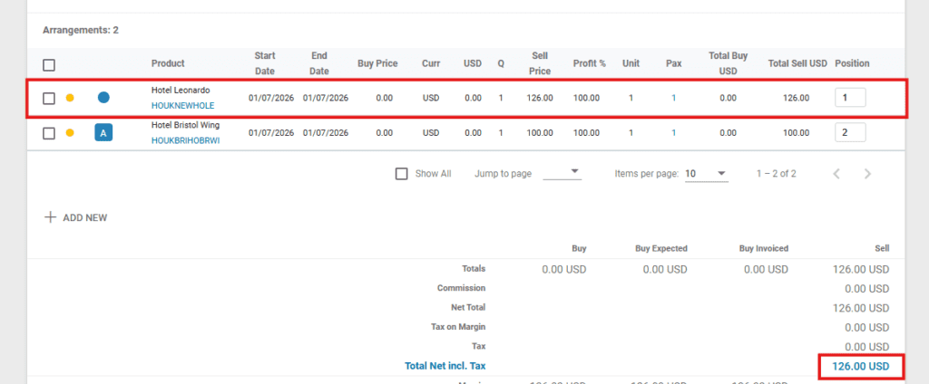 In the examples below the Car Rental arrangement is added with the Quantity of 1 even though it looks booked for two days.