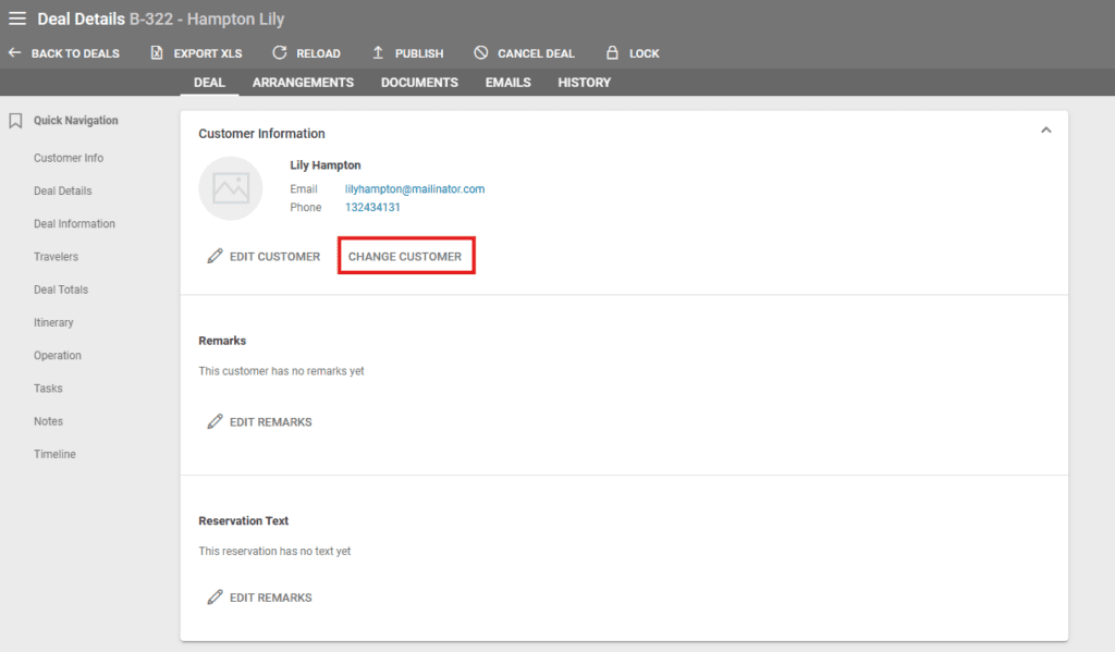 To change a Deal’s customer, please click on the “Change Customer” button in Deal Details.