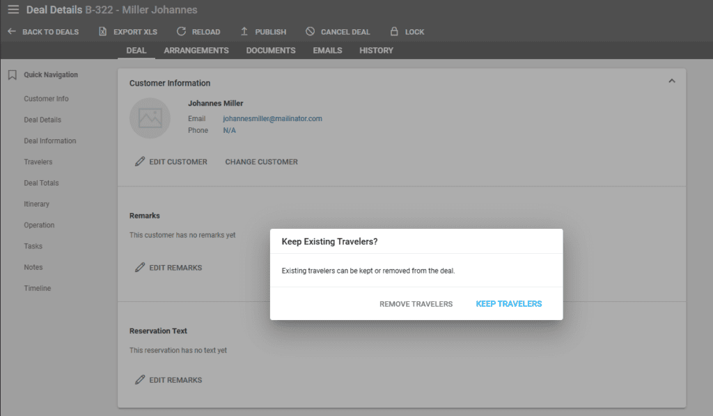 If you click NO, the existing travelers in this Deal are maintained, and only the customer is changed.