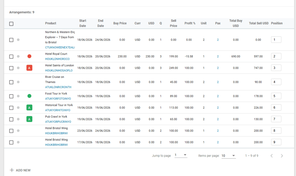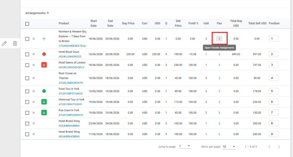 Under “Pax,” you’ll see the total number of travelers assigned per arrangement at the time of creating the deal. Hover your mouse over the number to reveal the option to Open Traveler Assignments: