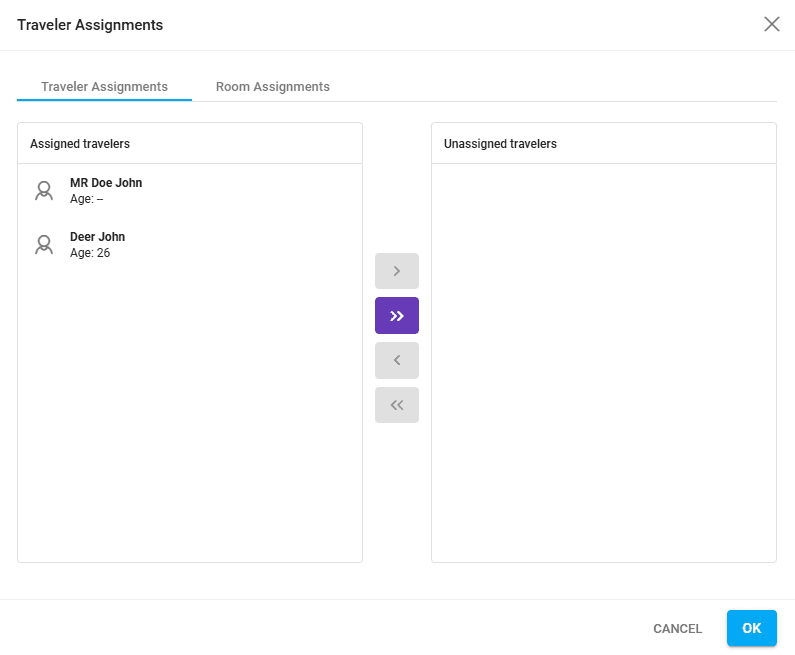 Click on the number of travelers. The Traveler Assignments window will open, allowing you to reassign travelers: