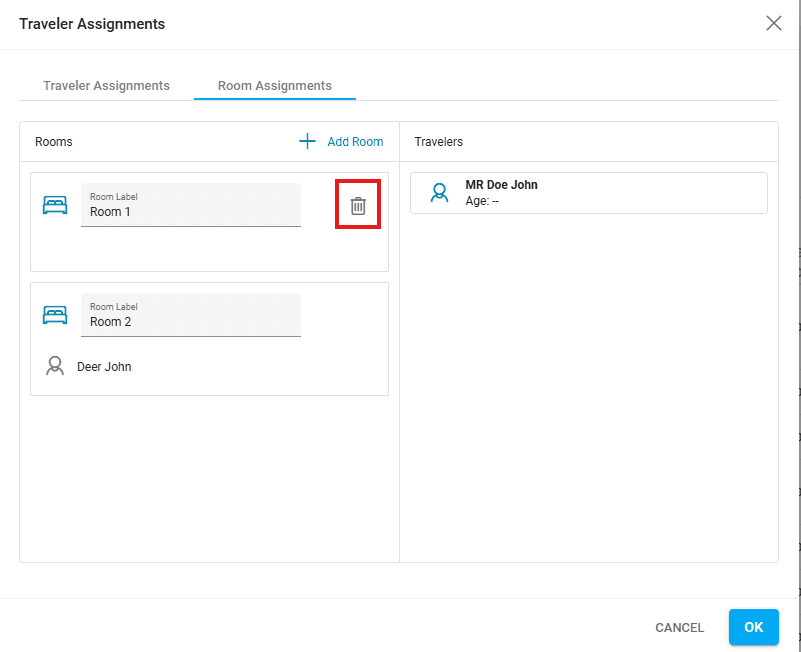 In the same section, a tab is also available for Room Assignments. Rooms can be added by clicking on the “Add Room” button. The Room label can be modified as needed. To assign a traveler to a room, please drag the respective traveler and drop them on their assigned room.