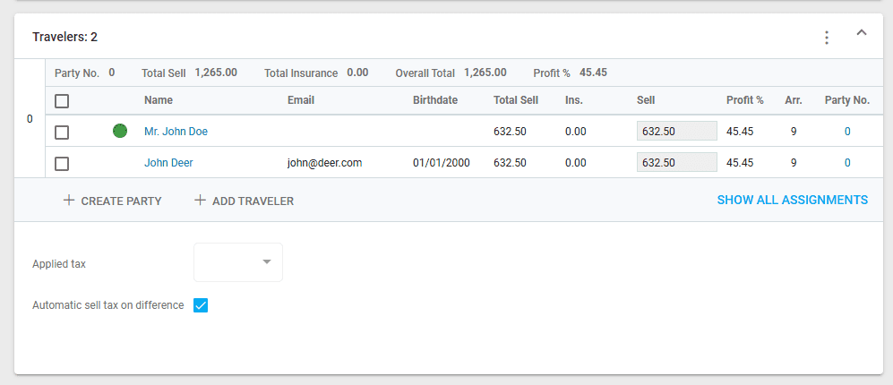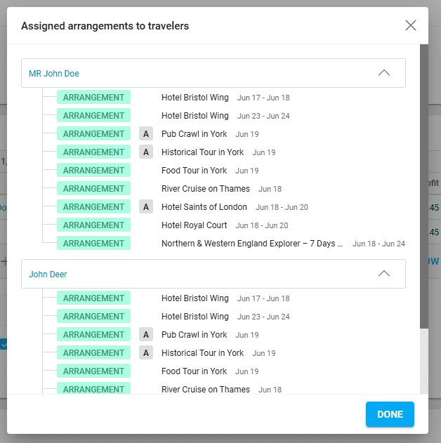 In the Deal tab of a deal’s details, the button “Show all assignments” in the traveler section displays all arrangements a traveler is assigned to. Each traveler has their assigned arrangements under their name.