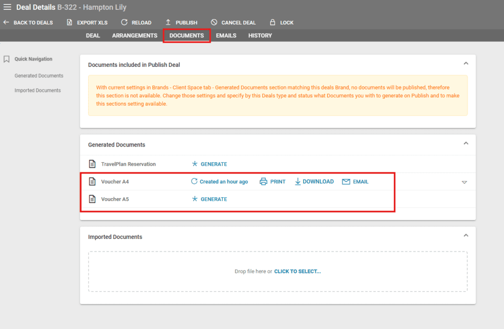 • Deal details in the Documents tab. The vouchers can be in A4 or A5 format.