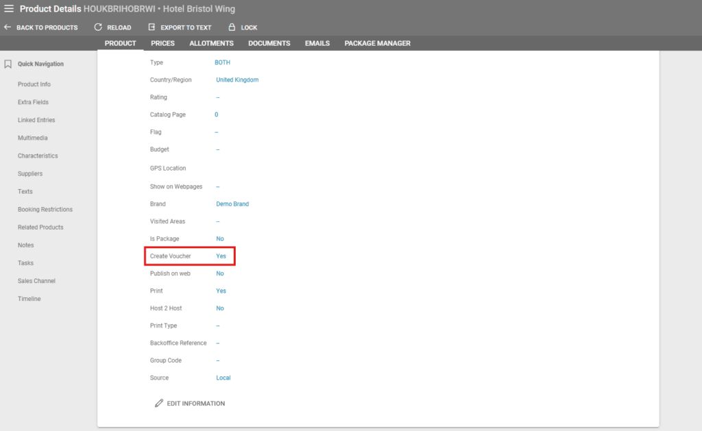 The creation process starts at the product level, so the first step is to set the Create Voucher option to Yes in Product details/Product Information.