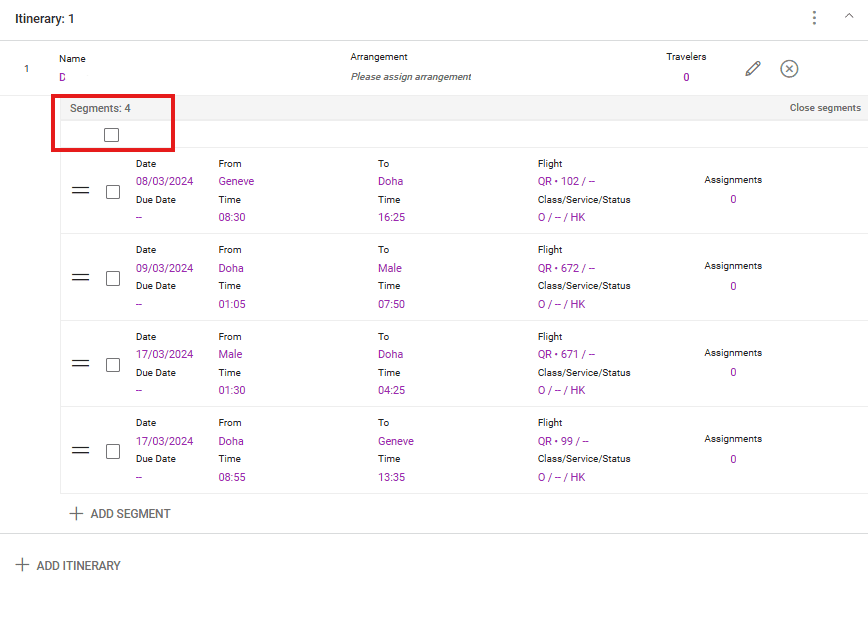 All itinerary segments can be selected at once by clicking on the checkbox above the segments.