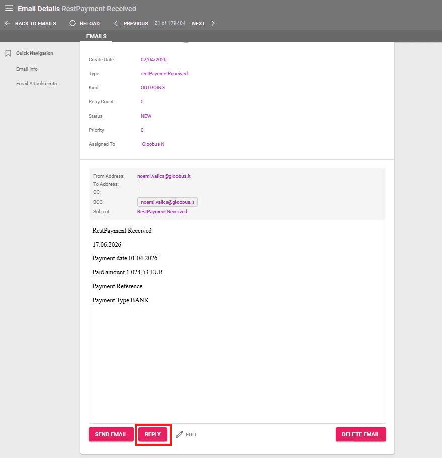 Once an email has been sent or imported, you can reply to it in Email Details.