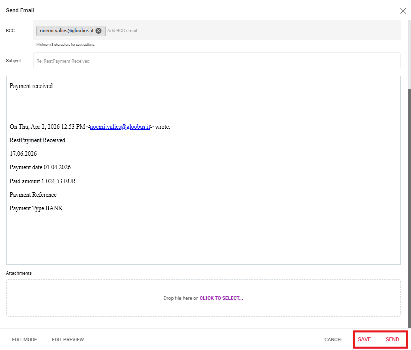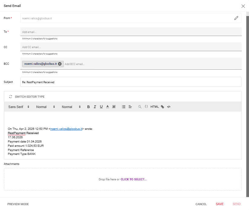 After filling out the necessary details, please click on “Preview Mode” to see how the email will look like, after which it can be saved or sent directly.