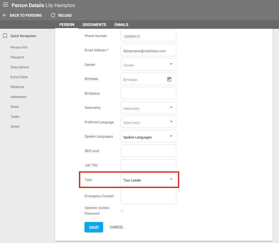 A Tour Leader can be a person associated with a supplier or an individual added to the Persons list with Tour Leader specified as their Type.