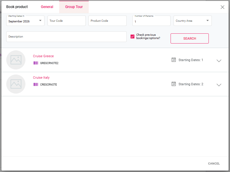 You can search by Starting Dates, Tour Code, Product Code, Country Area, Description, and the number of persons.