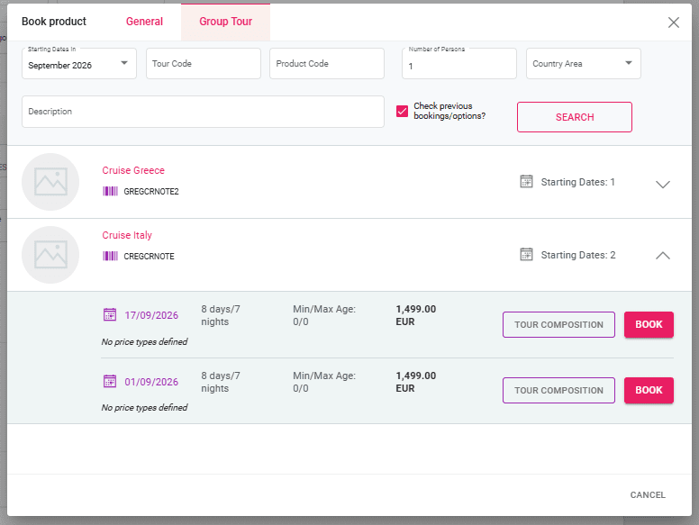 Only one group tour type product can be added per deal. Once there is a group tour arrangement in a deal, the “Group Tour” tab in the booking process is not available until the respective arrangement and all its supplements are deleted from the deal.