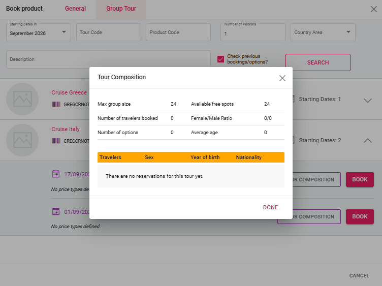 The operator should be able to overview the current composition of the group tour during the booking process for each starting date, considering other bookings in the system.