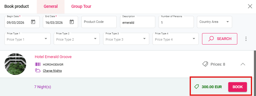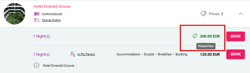 In the booking process, prices that have promo price applied will be displayed in a different color and have a price tag icon next to them. Upon hovering with your mouse, a tooltip will appear with the text “Promo Price”.