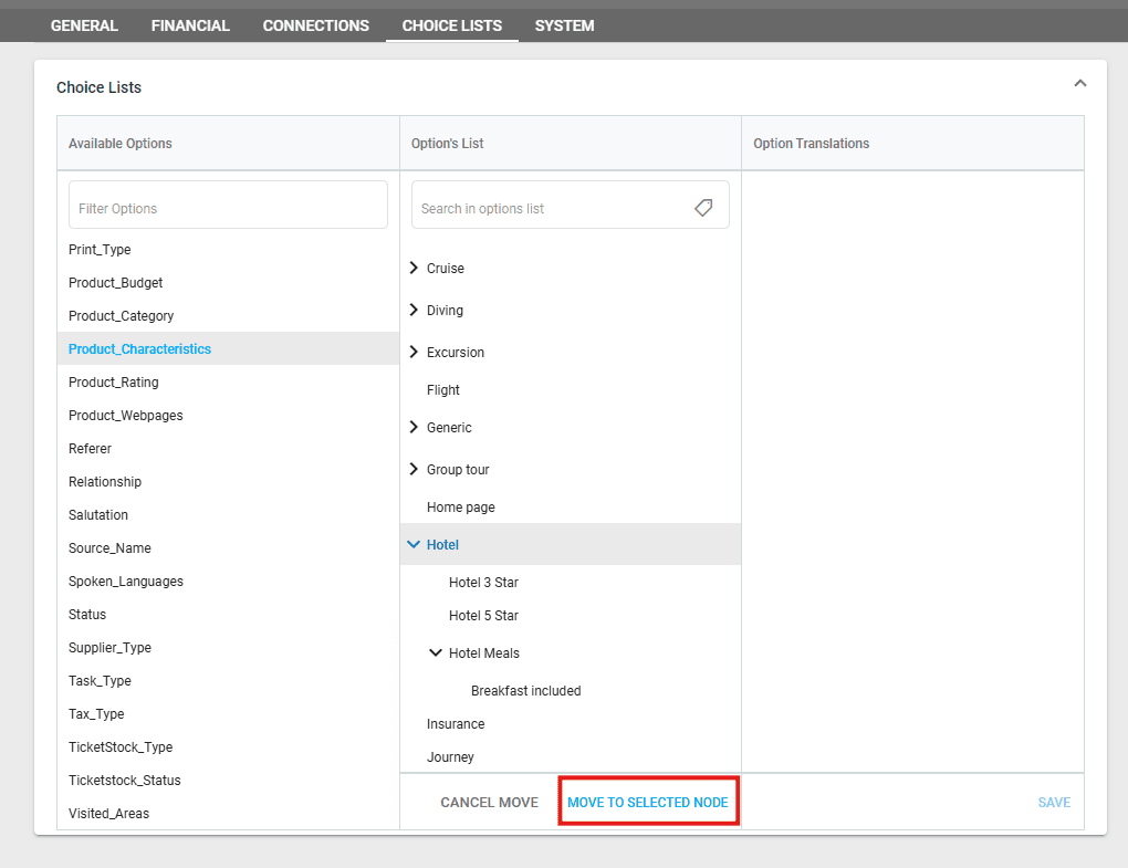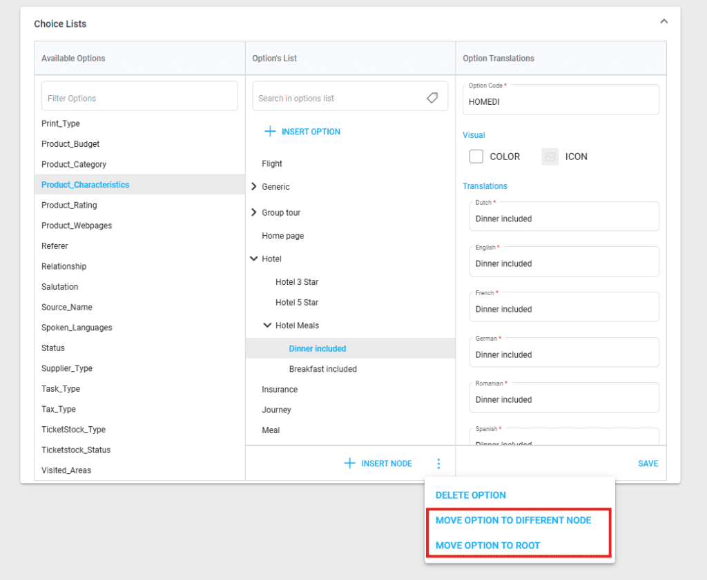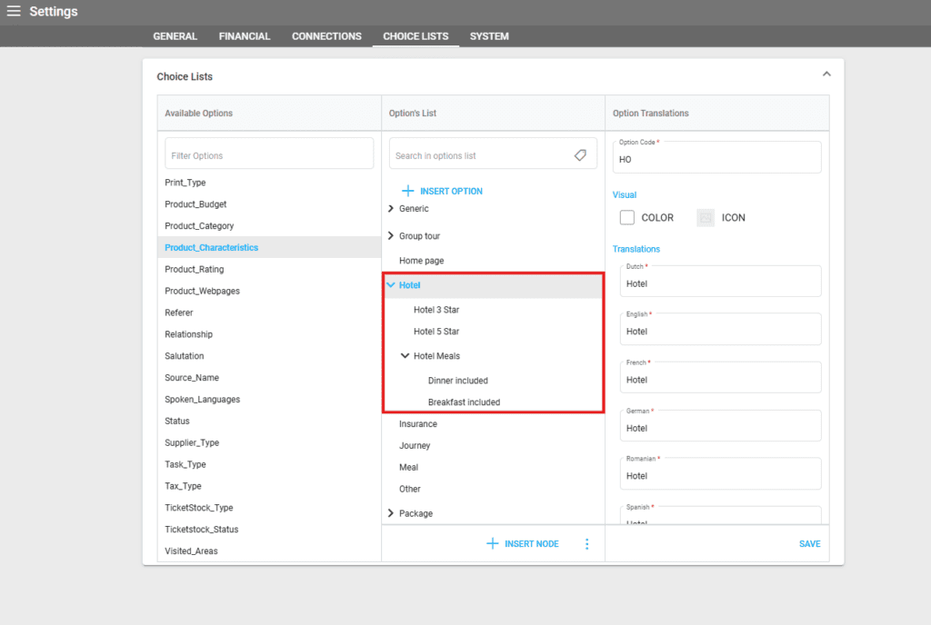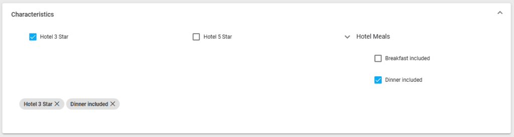 - Under this option, nodes can be inserted to add the characteristics: Hotel 3 Star, Hotel 5 Star, and Hotel Meals that has “Dinner included” and “Breakfast included” nested under.