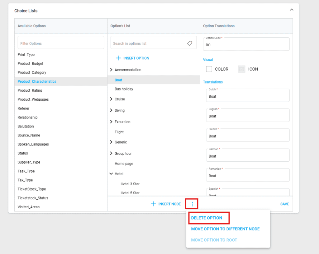 Options can be deleted by selecting them, then clicking on the three dots next to “Insert Node”. Please note that deleting an option with nodes under it will delete the nodes as well.