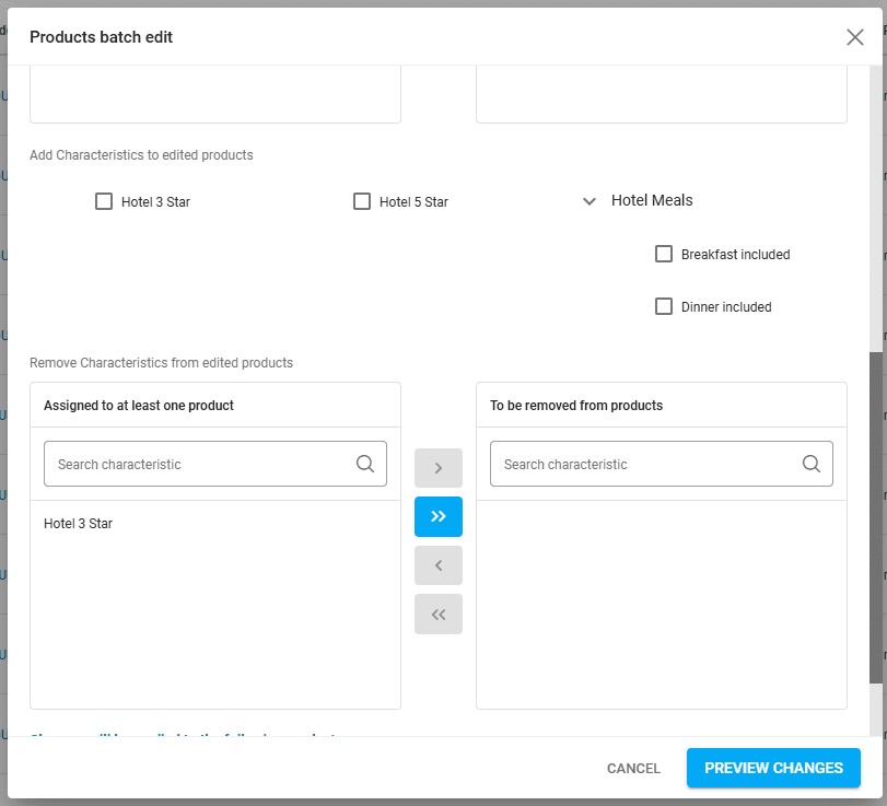 Characteristics can be selected by clicking on the respective checkbox. After saving, the characteristics are displayed at the bottom of the section. Clicking on the X inside a characteristic will remove it from the product.