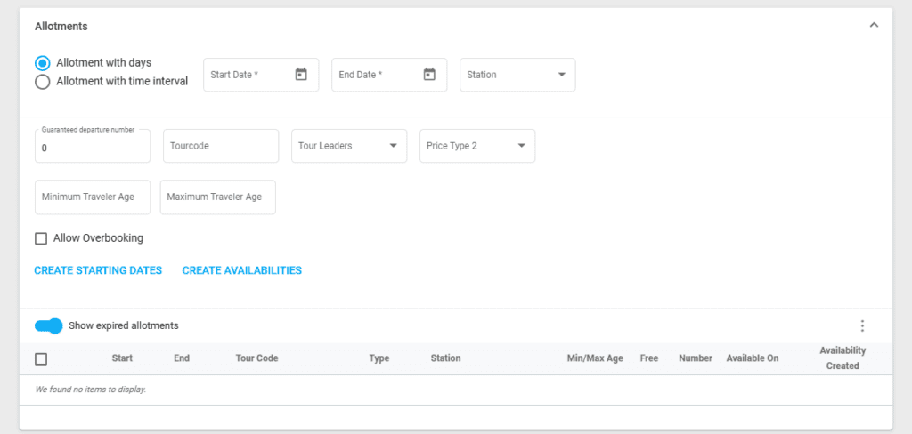 Sub-Allotment Settings: A sub-allotment can be set in this section. This feature is ideal for tours that start on the same date but offer both a standard and an extended version (for example a 7 day tour and a 14 day tour).