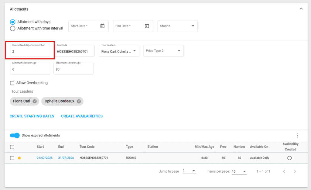 The No. for guaranteed departure marks the number of allotments that need to be reached so that the Guaranteed Departure status is set by the system for each allotment (starting date).