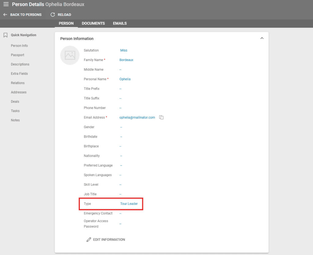 A Tour Leader is a person related to a supplier with the Type set to Tour Leader, or a standalone person to be set in the Persons list having Tour Leader Type.