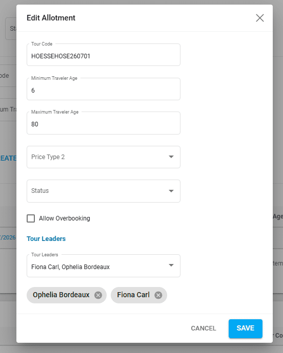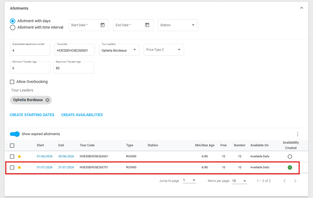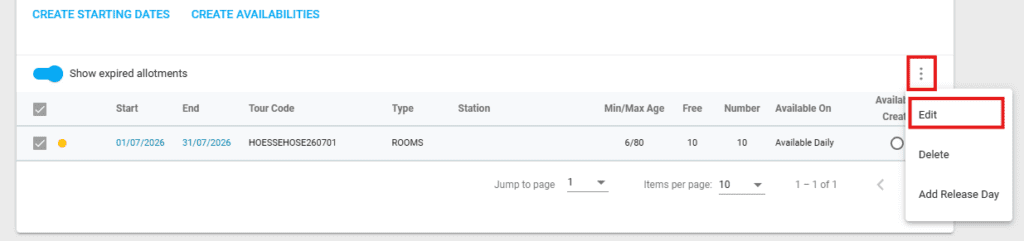 The starting dates are created, and the line becomes visible. Now, for the starting date to be bookable as a period, a Tour Code must be added to the allotment if it hasn’t been defined before creating it. Double click on the allotment line or select the checkbox and click edit from the actions menu in the upper right corner to edit the allotment.