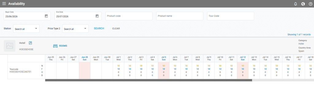 You may always check the availability of a product using the “Check Availability” option from the main left menu. A period of 30 days can be selected using the Begin Date and End Date fields. Further filters are available for Product code, Product name, Tour code and Price Type 2.