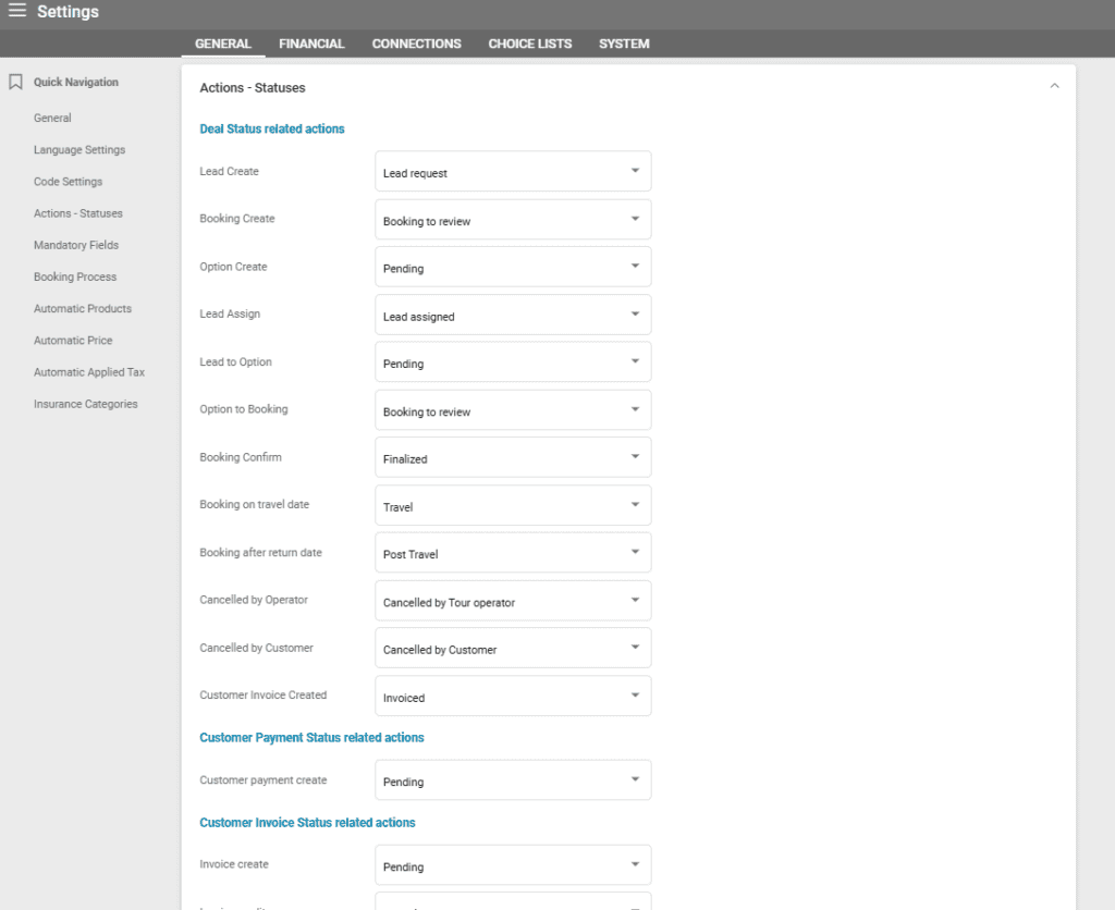 The Statuses tab should be used to establish the relationship between certain actions within the system and the status of items. For instance, when a Deal is created, its status will be marked as Pending if this option is selected from the dropdown menu.