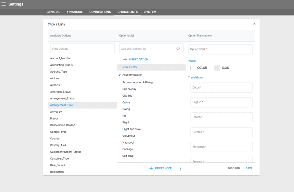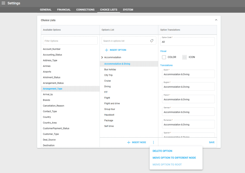 If you need to add a new option to the “Arrangement_Type” choice list, click INSERT OPTION, then add the option code and the translated labels. For each option, you may add different Nodes.