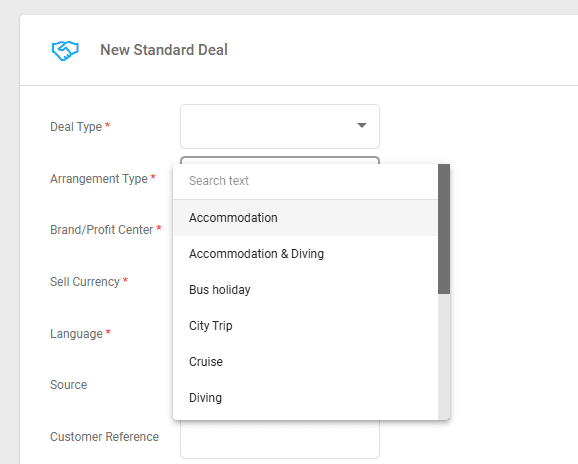 The entries in the Arrangement Type choice list are used at the beginning of your Deal process as a selection drop-down and will determine the type of arrangements in your Deal.