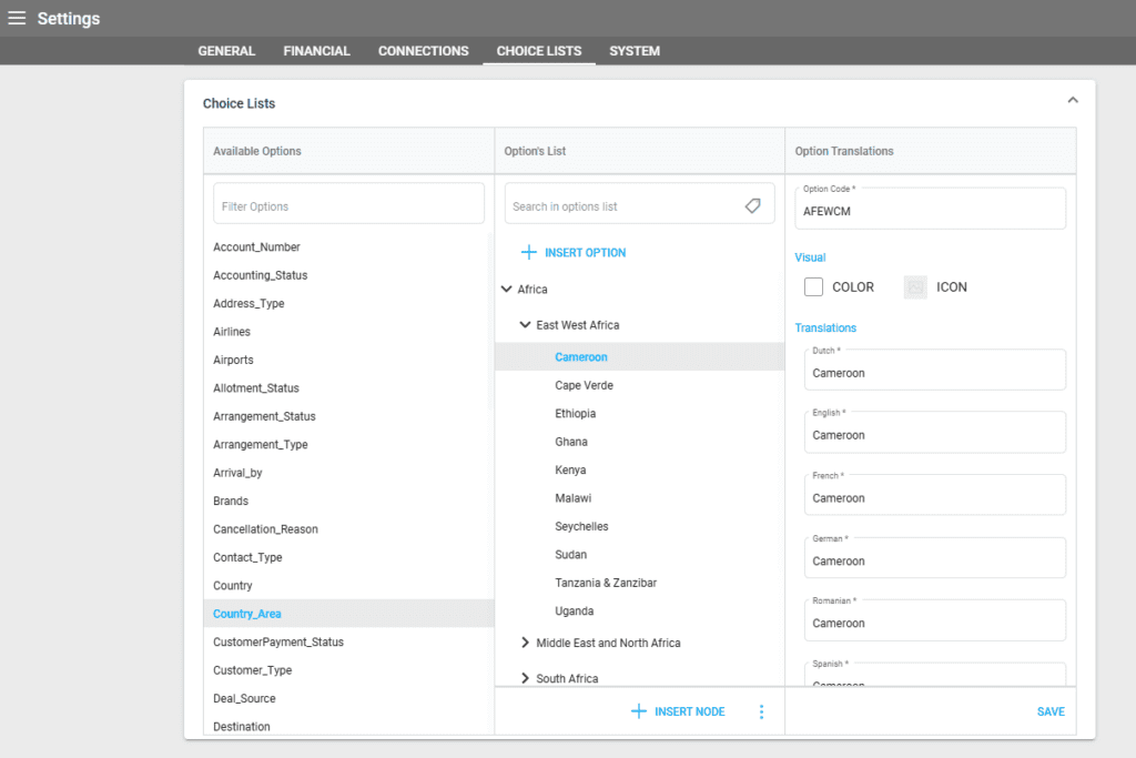 The Visual section in the choice list allows setting a color for each category and an Icon from the predefined icon list: Hotel, Flight, or Transfers.