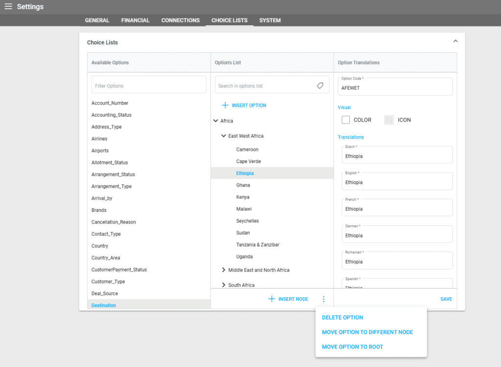 A collection of editable choices for types of fields – dropdown lists – that allow users to select options from a predefined set of choices. The choice list is used in many places across Victoury, including addresses, products, trips, prices, etc.