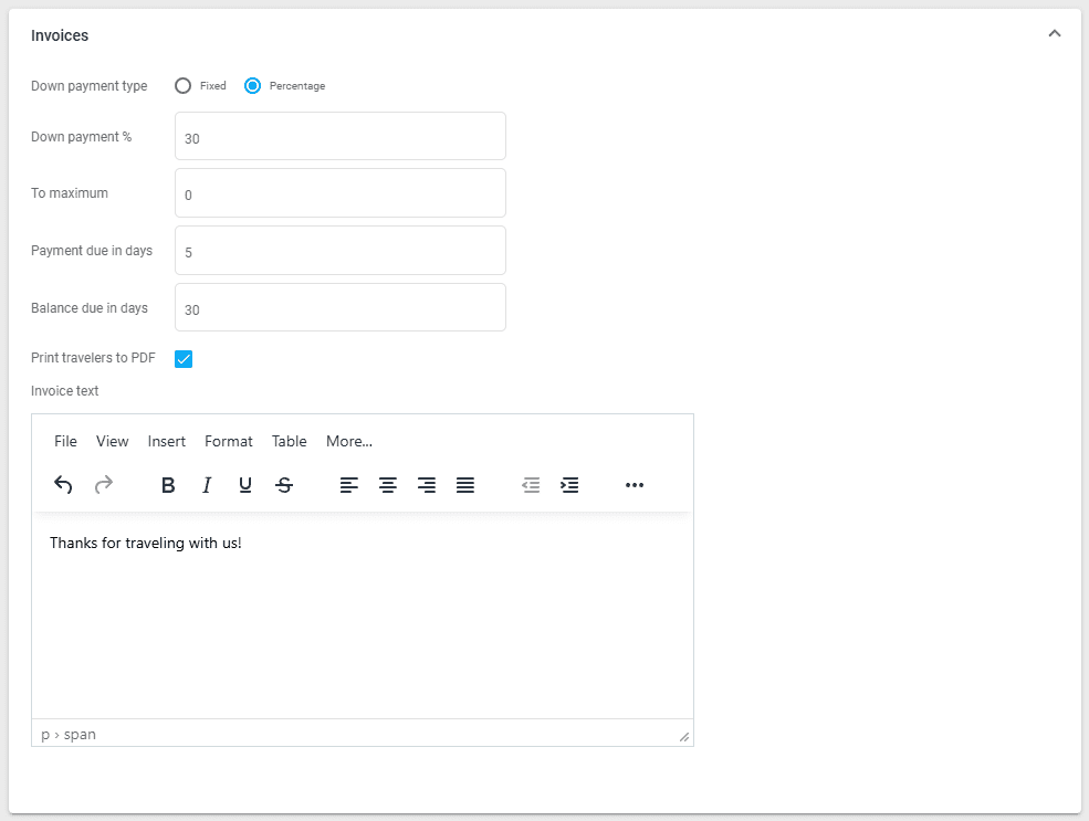 In the Invoices section, you can select from two types of down payments that are automatically applied to the customer invoices generated.