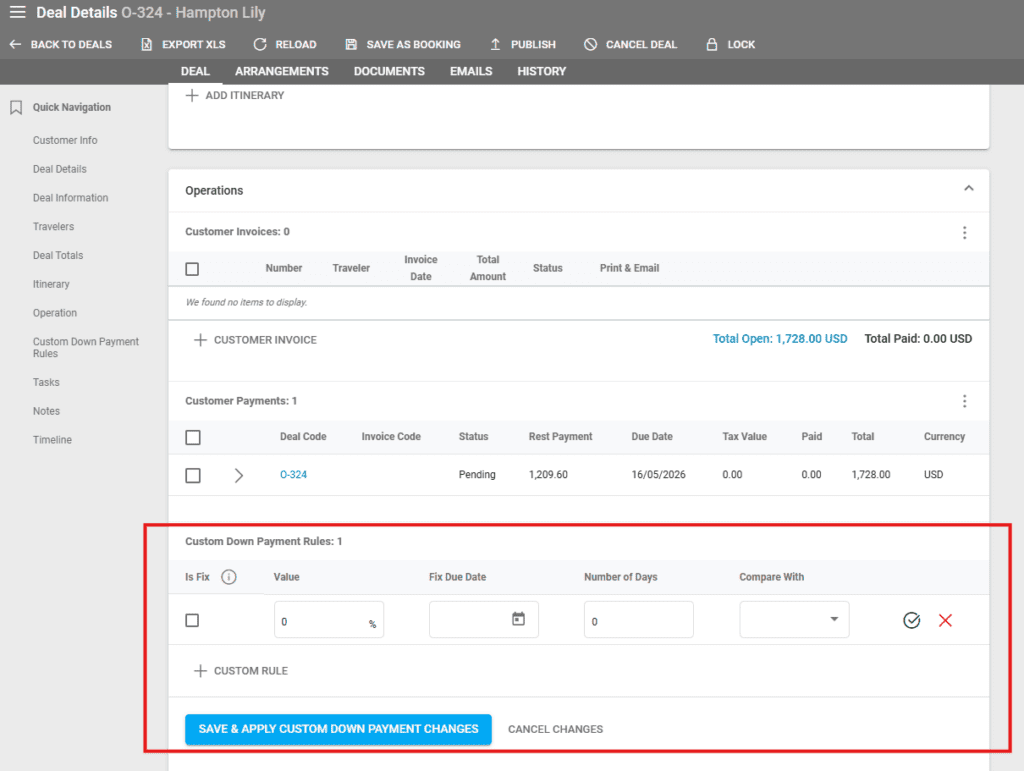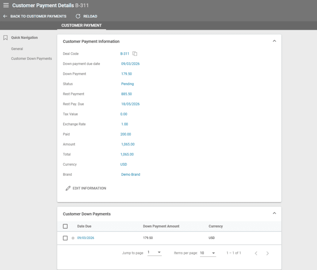 A new section appears under the Customer Payments section in Operations where you can set up custom down payment rules. For more information, please check the dedicated article on custom down payments here.