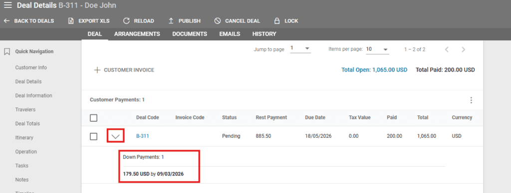 Rest and Down Payments can be viewed in each deal under the Operations section in Deal Details.
