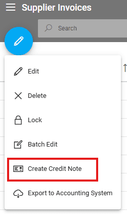 A supplier invoice can be credited using the edit function from the main Supplier Invoices list. First, select the invoice, then click Edit and Create Credit Note.