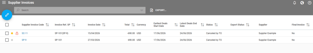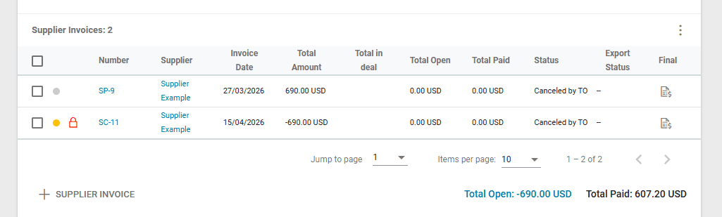 The system will display the original Supplier Invoice and the newly created Credit Note. The status is set to “Canceled by TO”.