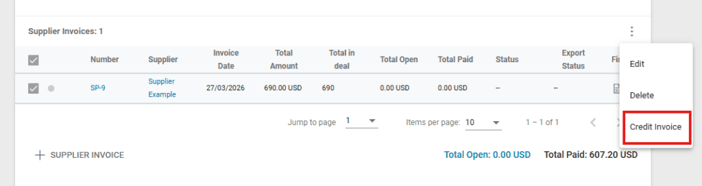Credit Notes for Supplier Invoices can also be created in the respective deal.