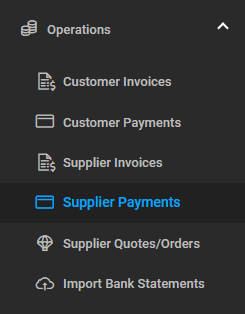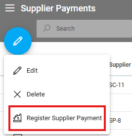 To register a supplier payment, navigate to Operations/Supplier Payments from the left main menu. Select one or more entries that have a created supplier invoice, click on the edit symbol, and then choose Register Supplier Payment.