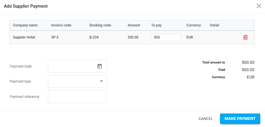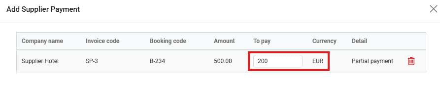 The total amount to be paid is pre-filled, but you can enter a different amount if the payment is partial or exceeds the supplier invoice value. If the amount is lower, the Details column will display “Partial Payment.”