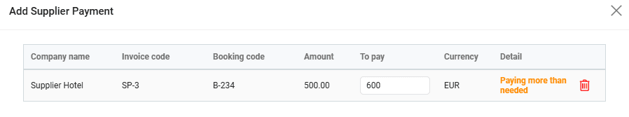 If you enter an amount that is greater than the supplier invoice amount, the Details column will indicate “Paying more than needed.”